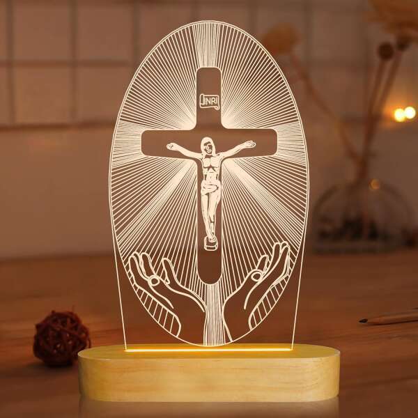 Ši 3D naktinė lemputė skleidžia švelnią, raminančią šviesą, kuri pripildo jūsų kambarį šilumos ir dvasingumo. Tai sukuria tobulą atmosferą maldai, poilsiui ar apmąstymams.