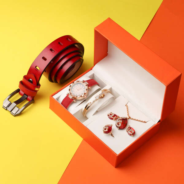 6 dalių papuošalų rinkinys, laikrodis ir diržas